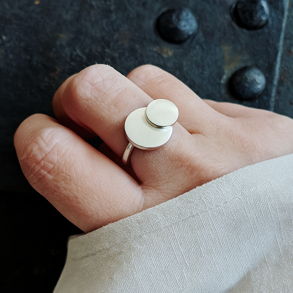 Discover the elegance of the Personalised Silver Ring 50/K, a stunning piece crafted from Recycled Silver 925. This innovative design features a mother represented by a larger circle and a daughter in a smaller circle, symbolizing the unbreakable bond between them.