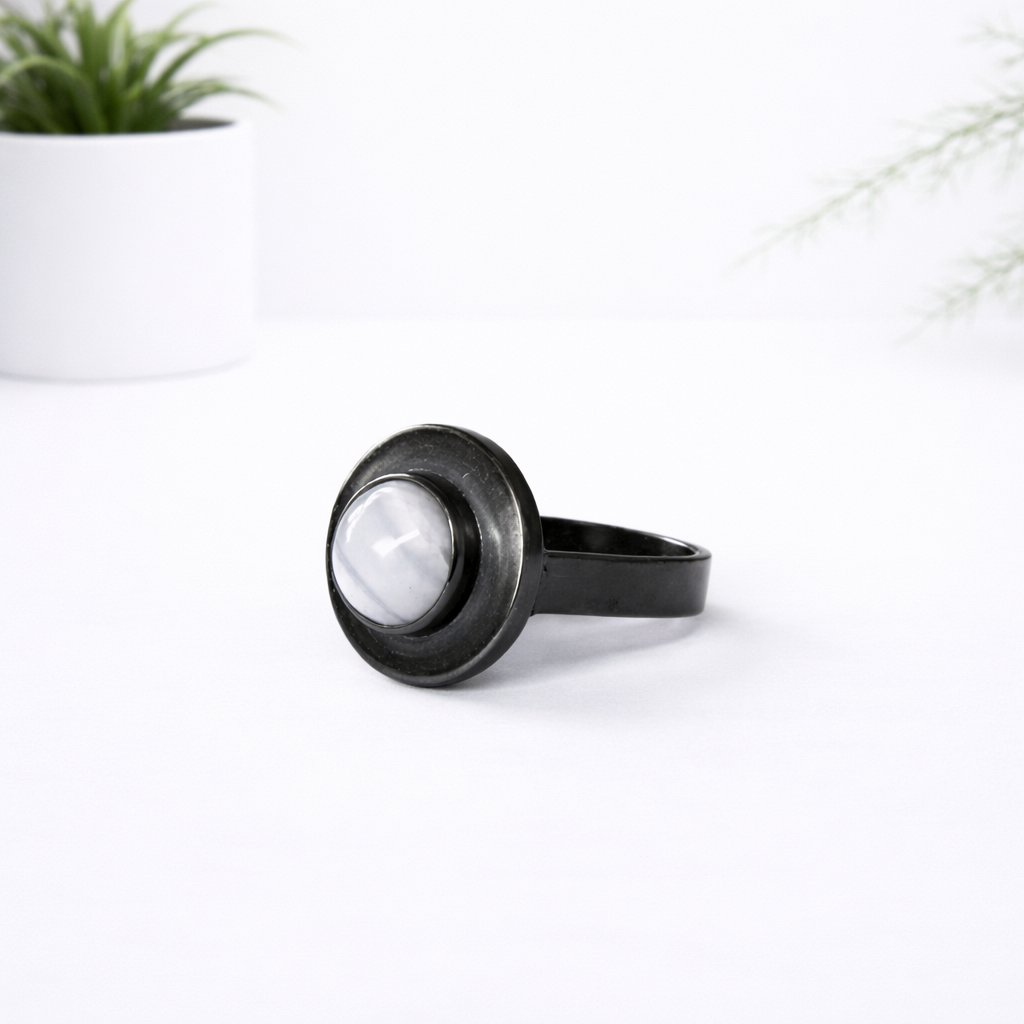 This stunning Silver Ring With Blue Lace Agate is the perfect accessory for any occasion. Crafted from recycled silver 925 and featuring a black oxidised effect, this ring is sure to turn heads. The blue lace agate stone is said to be a stone of communication, helping people to become more confident and articulate. Available in size 55, this ring is perfect for those who need to speak in public or just want to add a touch of elegance to their look.