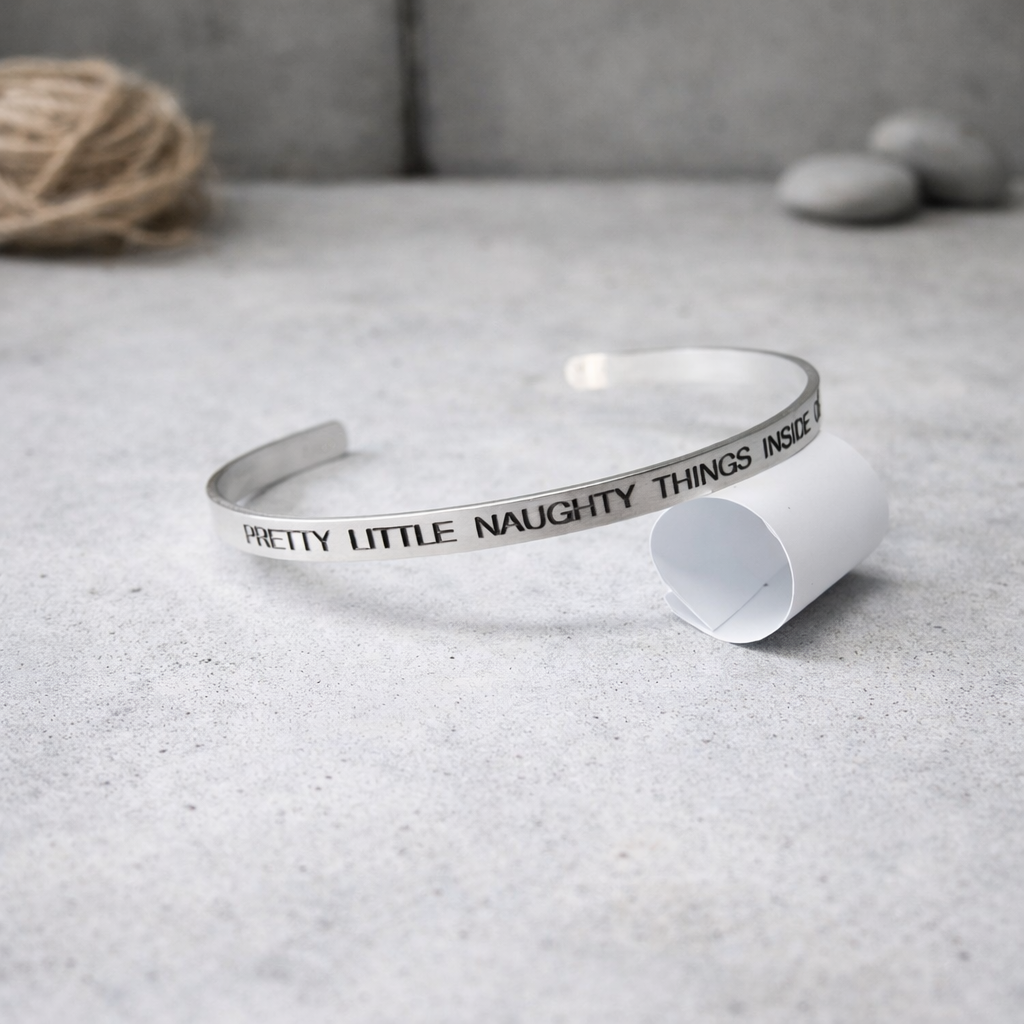 Wir präsentieren unseren Armreif aus 925er Silber, ein atemberaubendes Schmuckstück, das nicht nur schön, sondern auch umweltfreundlich ist. Dieser Armreif aus 925er Silber besteht aus recyceltem 925er Silber. Der Armreif aus 925er Silber ist nicht nur ein stilvolles Accessoire, sondern auch eine nachhaltige Wahl. Er trägt den Prüfstempel, der die Qualität und Echtheit des verwendeten Silbers sicherstellt. Der Armreif aus 925er Silber ist zart mit den Worten „PRETTY LITTLE NAUGHTY THINGS INSIDE OF ME“ eingraviert, was dem Design einen Hauch von Verspieltheit und Persönlichkeit verleiht. Wenn Sie Ihren eigenen Text hinzufügen möchten, senden Sie uns einfach während des Bezahlvorgangs eine Nachricht und wir machen ihn möglich. Bitte beachten Sie, dass es aufgrund der personalisierten Natur dieses Armreifs bis zu 14 Tage dauern kann, bis Ihre Bestellung bearbeitet und versendet wird. Das liegt daran, dass jeder Armreif von Assay Birmingham gestempelt werden muss, um seine Qualität und Echtheit sicherzustellen. Der Armreif hat eine Breite von 4 mm und eine Dicke von 1,30 mm und ist somit ein zierliches und elegantes Schmuckstück, das allein oder in Kombination mit anderen Armbändern getragen werden kann. Investieren Sie in ein einzigartiges und bedeutungsvolles Schmuckstück mit unserem personalisierten Armreif aus Silber 925. Erweitern Sie Ihre Sammlung nicht nur um ein stilvolles Accessoire, sondern entscheiden Sie sich auch bewusst für Nachhaltigkeit. Bestellen Sie noch heute und setzen Sie mit diesem wunderschönen Armreif ein Statement.