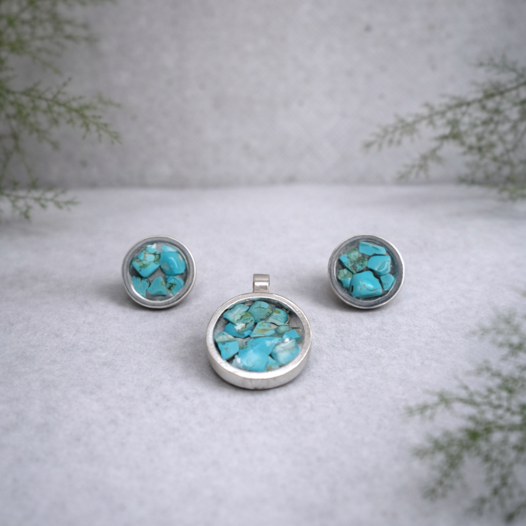 Earrings measuring 13mm in diameter and weighing 2.90g, these studs are the perfect size for everyday wear. Turquoise is known for its powerful healing properties, including the ability to cleanse negative energy and bring good fortune. It is also believed to enhance communication by connecting to the throat chakra, making this set not only stylish but also spiritually beneficial.